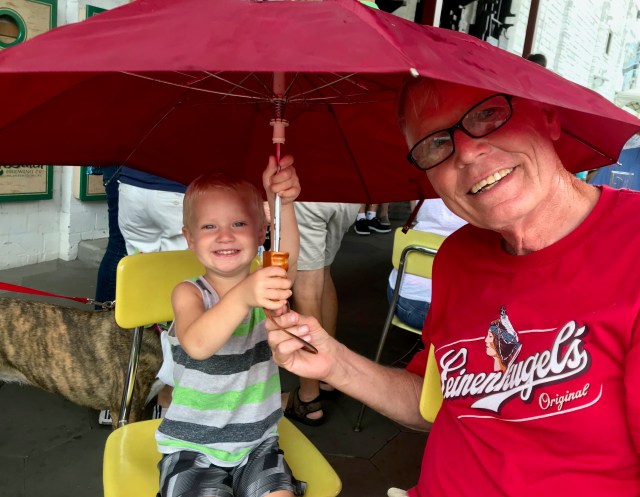We also went to a Dog costume contest parade at Green Bench Brewery with Grandma and Grandpa. We met Elle from Stranger Things! An afternoon rain storm interrupted the parade and sent us under umbrellas.