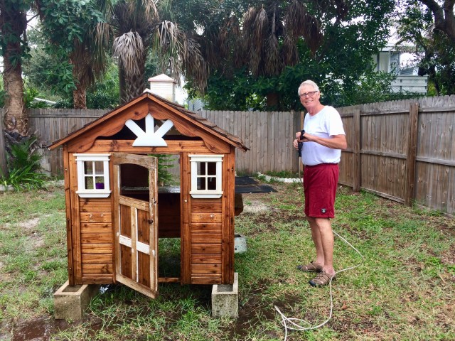 Grandpa and Adam worked on pressure washing and staining the kids play house that Granny bought for Cora’s birthday. This cedar playhouse needed a little TLC.