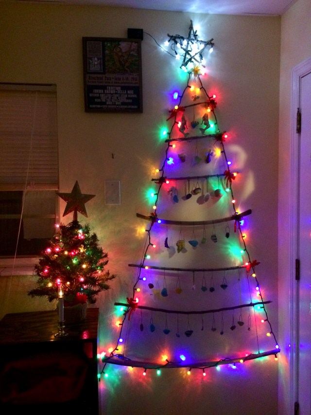 Our beach house is tiny and we had to get a little creative with our Christmas tree this year. The kids and I collected sticks and tied them together using twine. Then we strung a string of lights and hung shells we have collected and painted. I also made a Christmas star to top the tree. It has all the charm and warmth of a real tree while fantastically flat against the wall! This is our beach tree!