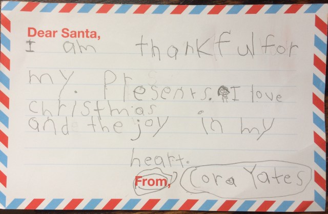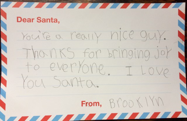Hers says: You are a really nice guy. Thanks for bringing joy to everyone. I love you, Santa.