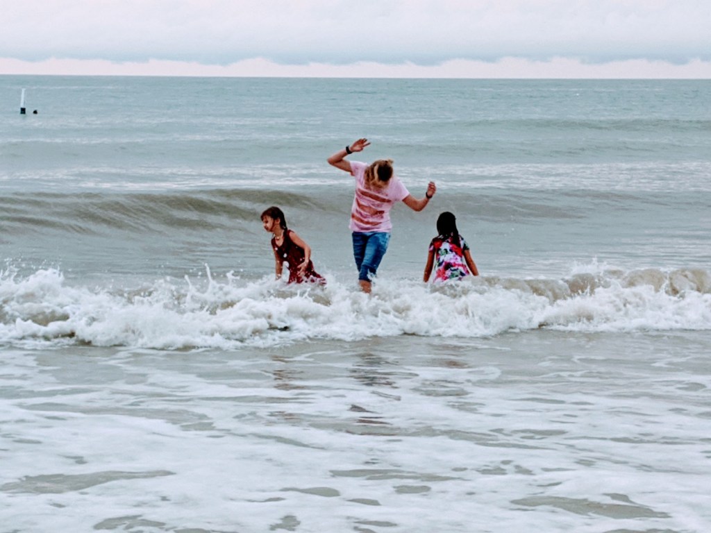 Addy and the girls slowly crept into the surf in their clothes. It was such a slow progression that at some point they were so wet they went in all the way.