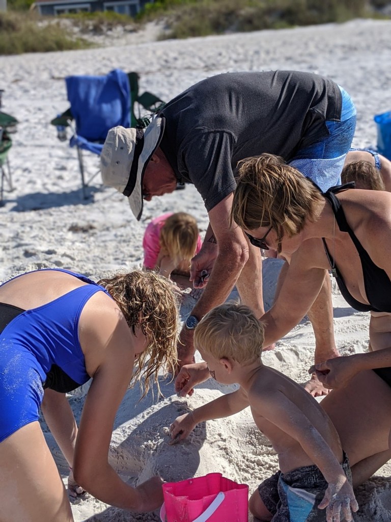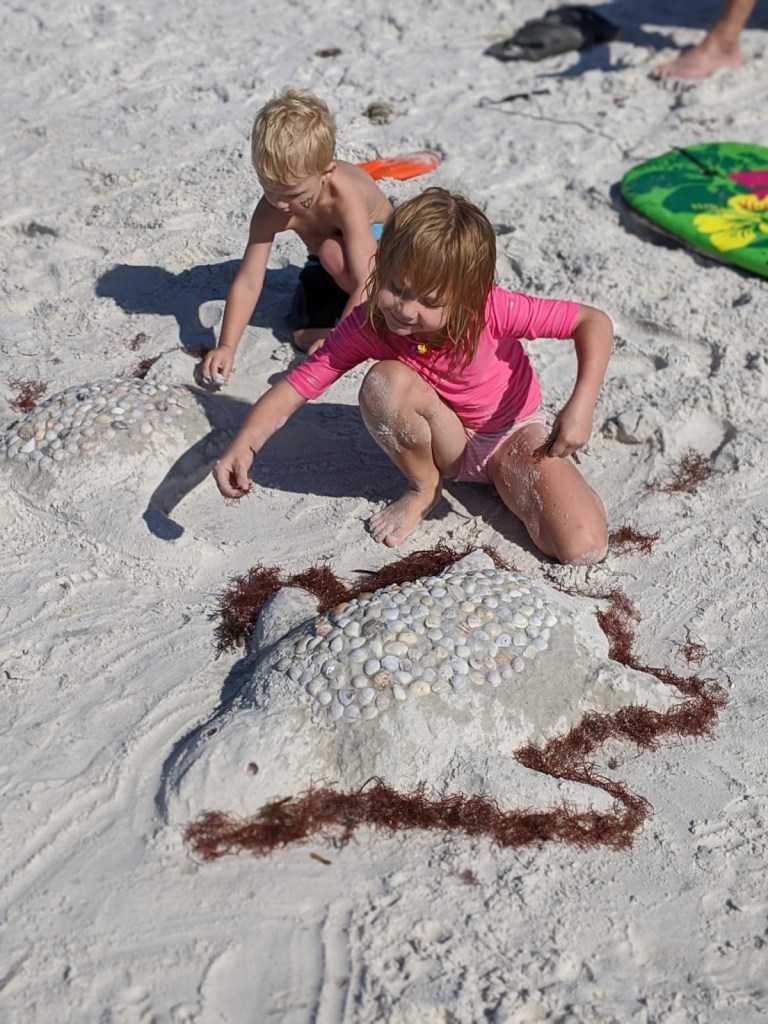 Heather and Addy starting forming sea turtles and the entire family jumped onto the task and created these pieces of art together. It was so fun to watch these turtles take shape and it was fun to feel proud together when they were finished. This is a memory with family I will cherish. This warm sunny beach day and our turtle family creation is without a doubt the highlight of Heather and the kid’s visit. The ocean is just plain magical.