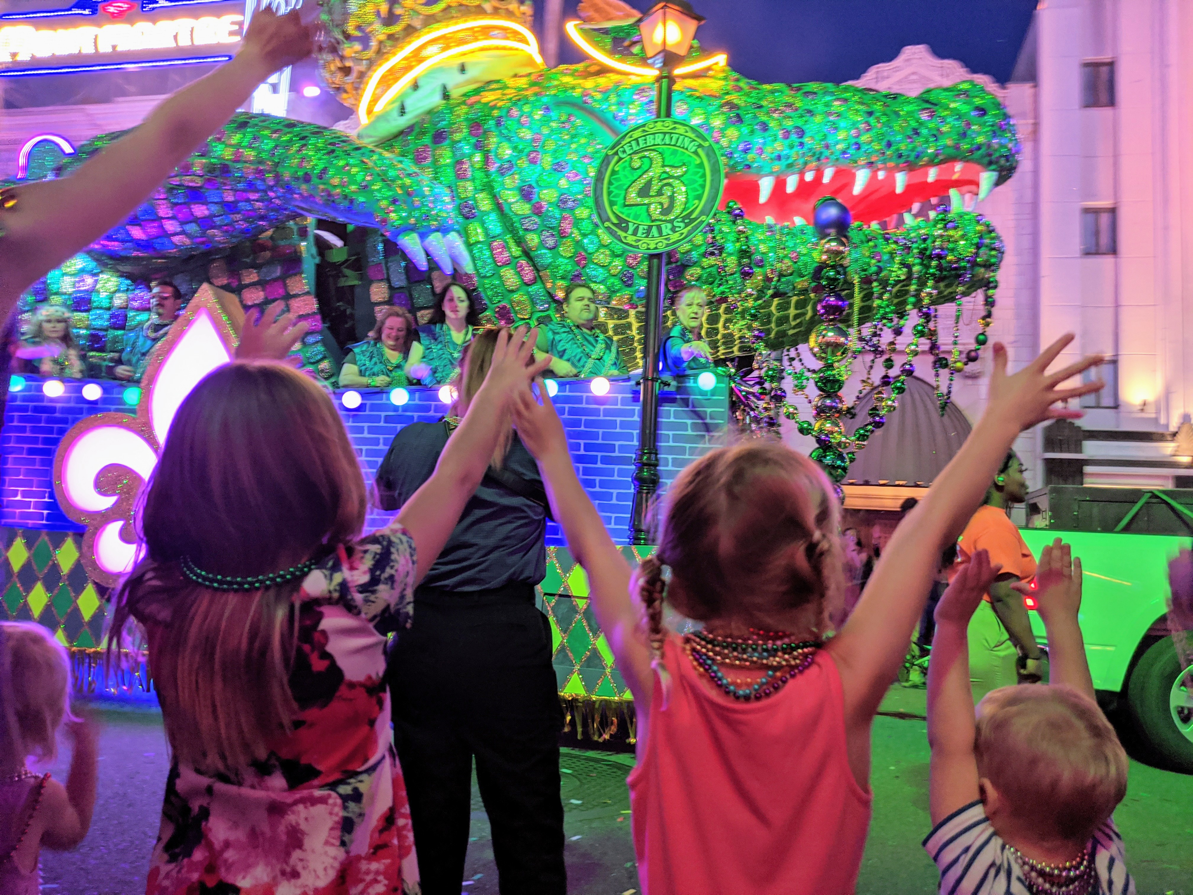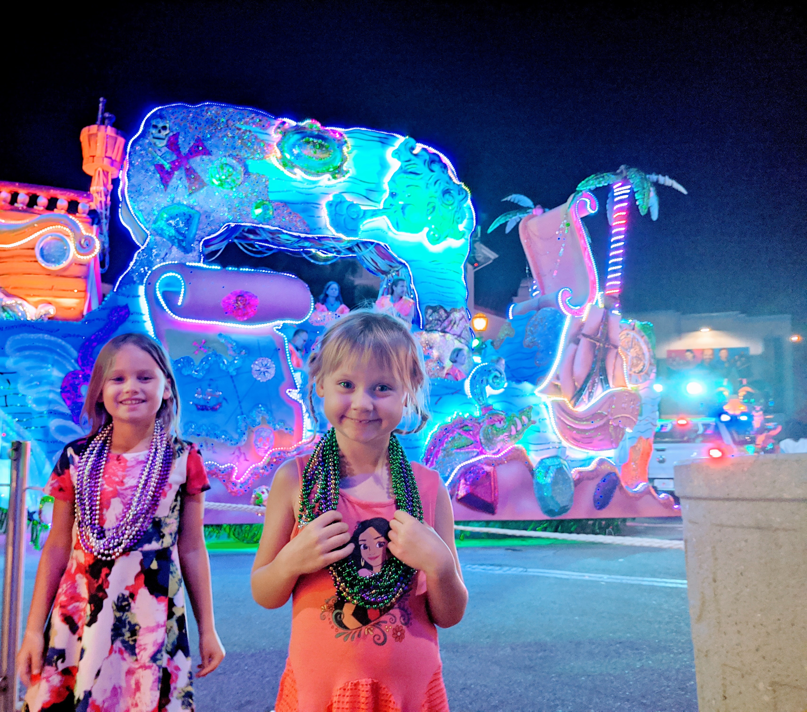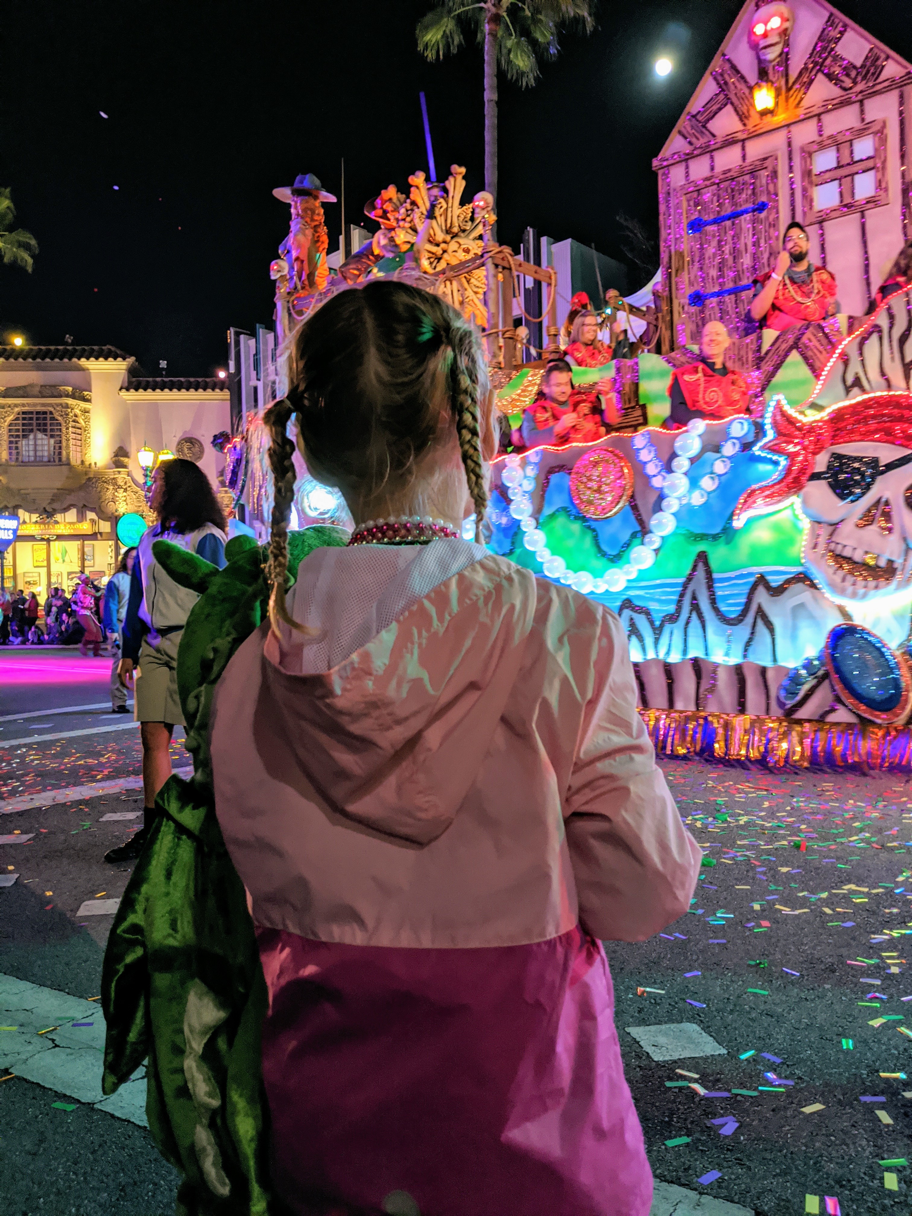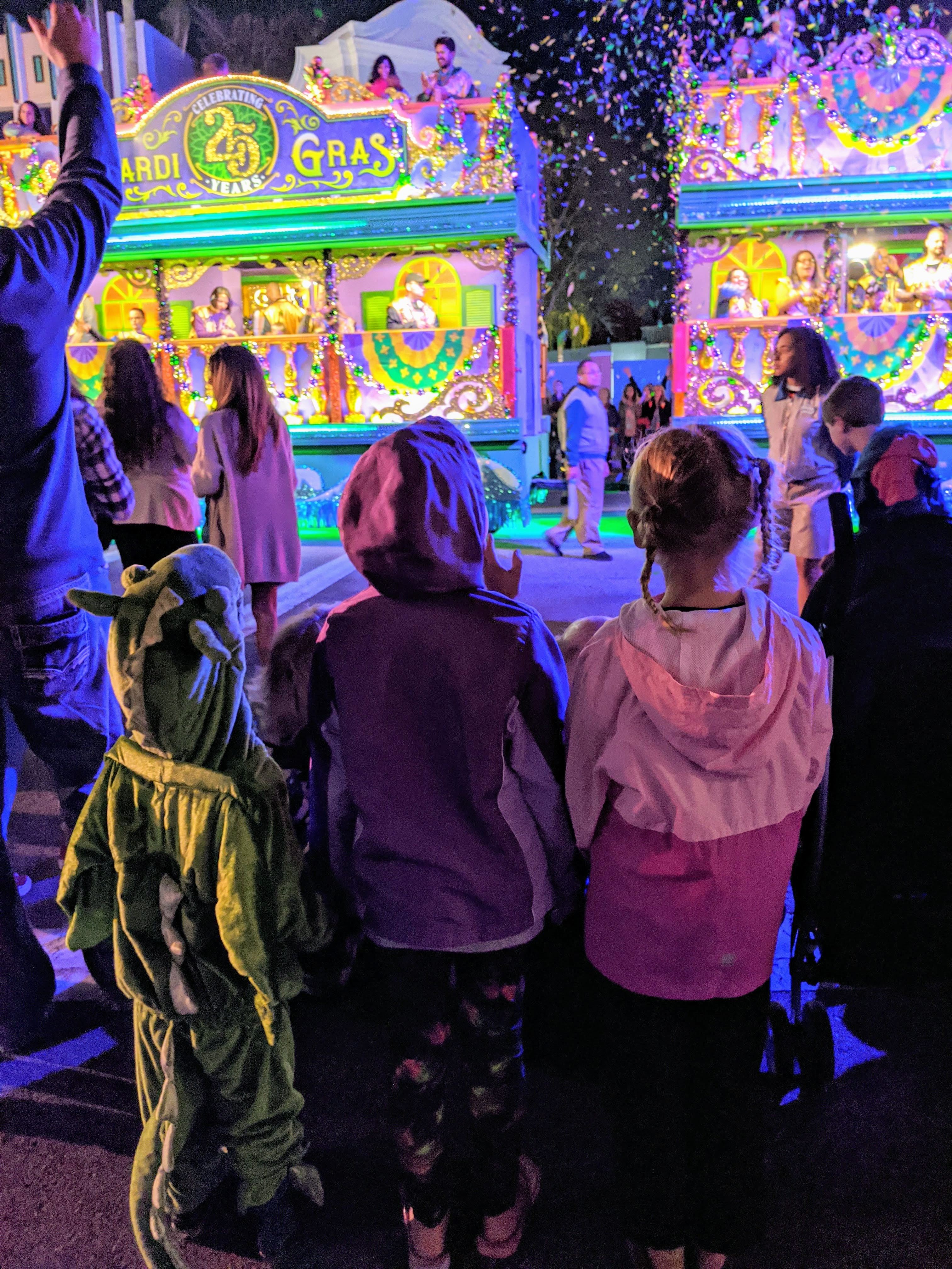 Universal has a Mardi Gras celebration and parade and they are celebrating 25 years of the parade. The floats, costumes, and joyful energy is so outrageously great that we saw the parade 6 times! The floats throw Mardi Gras beads and the kids love that. They leave each parade with four pounds of colorful beads. Our backyard fence is now extremely well dressed! The kids enjoyed giving the beads away to others later in the evening. Adam had family in New Orleans and went often to Mardi Gras as a kid and I think he particularly enjoyed the food and festivities.