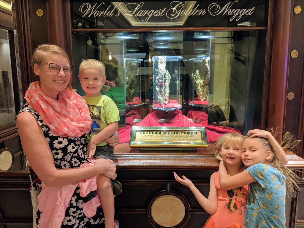 We spent one night downtown Las Vegas at The Golden Nugget. We visited the downtown container park and Fremont Street. Fremont Street had a three block long canopy light show synced to music which was pretty spectacular. Street performances and scantily dressed women were everywhere. Our hotel displayed the world’s largest Golden Nugget which we estimated to be valued at 1.5 million.