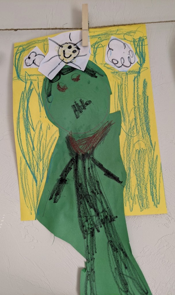 My favorite art from Cora is this zombie. Even in her scary zombie art Cora must include a bright beautiful sun.