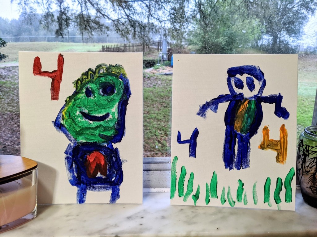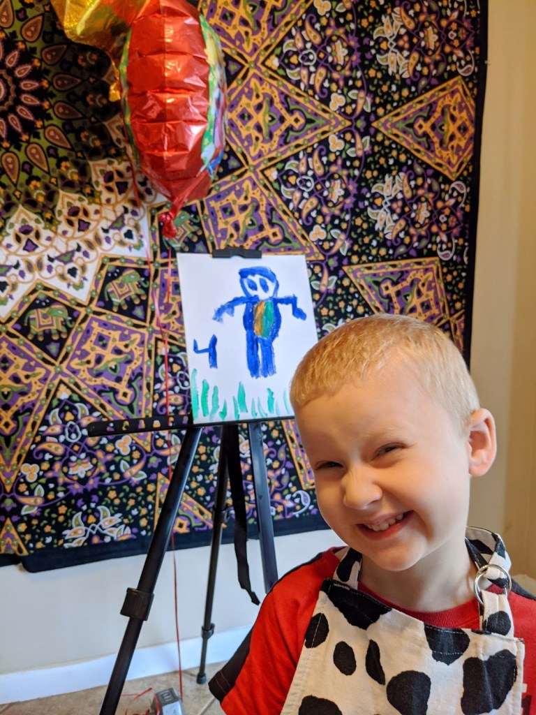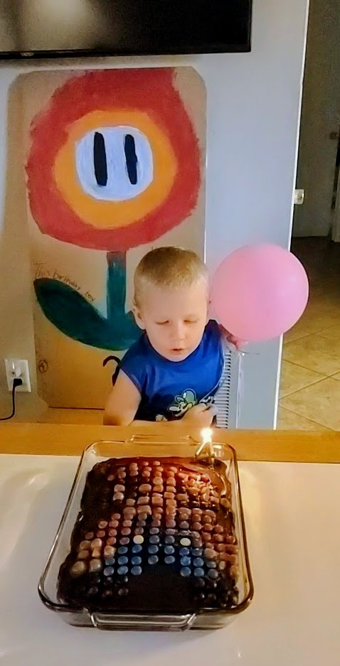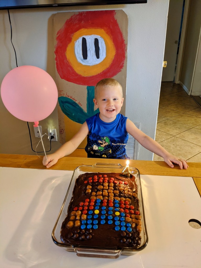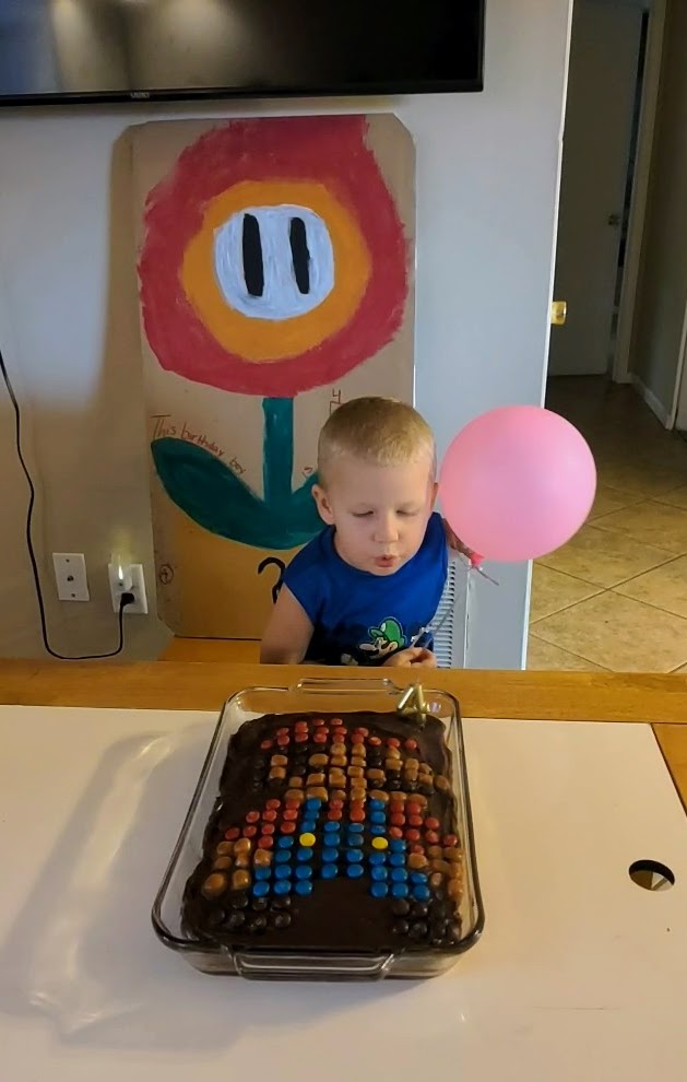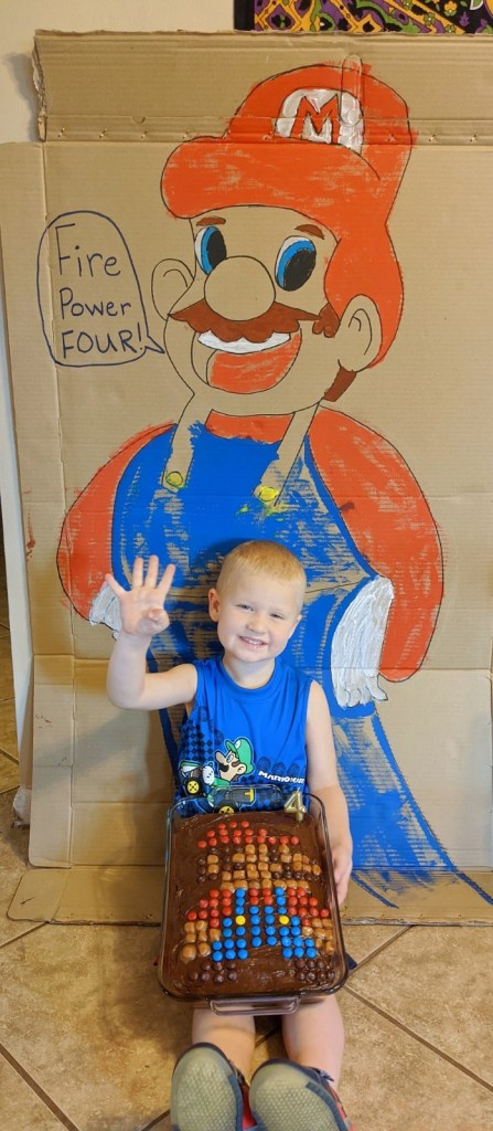 We celebrated Dylan’s fourth birthday with a Mario Brothers themed birthday party. The little artists created life sized Mario and Luigi paintings, along with lots of other game related masterpieces. The girls were surprisingly focused on sketching the figures via a YouTube tutorial and Dylan loved helping to paint them.